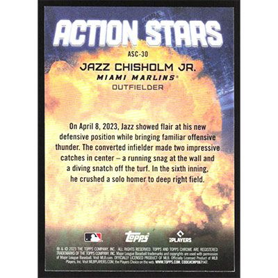 This is a 2023 Topps Chrome Update Action Stars Jazz Chisholm Jr. baseball card. The card is #ASC-30 and pictures show condition.