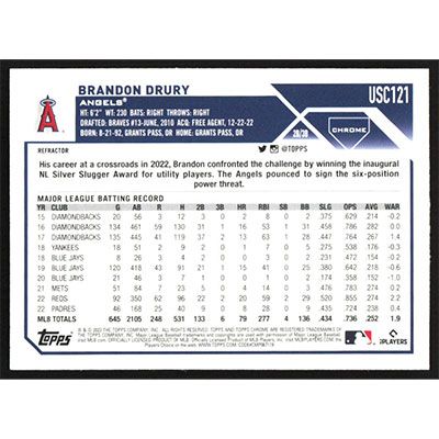 This is a 2023 Topps Chrome Update Refractors Brandon Drury baseball card. The card is #USC121 and pictures show condition.