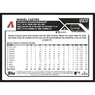 This is a 2023 Topps Chrome Update Sepia Refractors Miguel Castro baseball card. The card is #USC57 and pictures show condition. Team(s): Arizona Diamondbacks