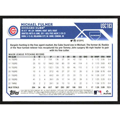 This is a 2023 Topps Chrome Update Michael Fulmer baseball card. The card is #USC183 and pictures show condition.