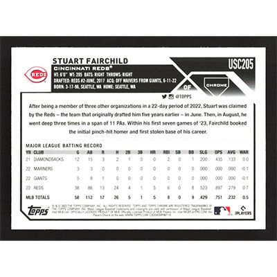 This is a 2023 Topps Chrome Update Stuart Fairchild baseball card. The card is #USC205 and pictures show condition.