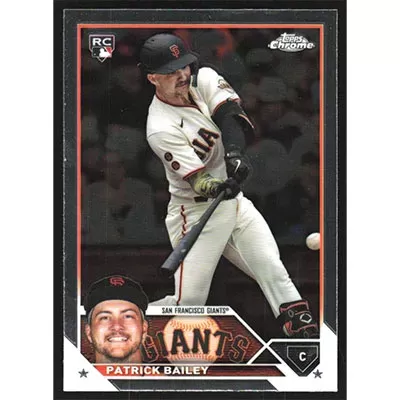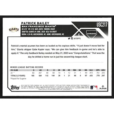 This is a 2023 Topps Chrome Update Patrick Bailey baseball card. The card is #USC217 and pictures show condition. Team(s): San Francisco Giants Rookie Card (RC)