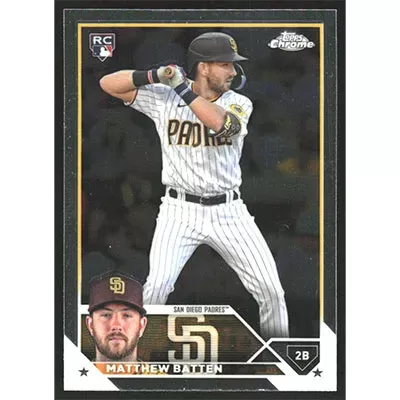 This is a 2023 Topps Chrome Update Matthew Batten baseball card. The card is #USC72 and pictures show condition. Team(s): San Diego Padres Rookie Card (RC)