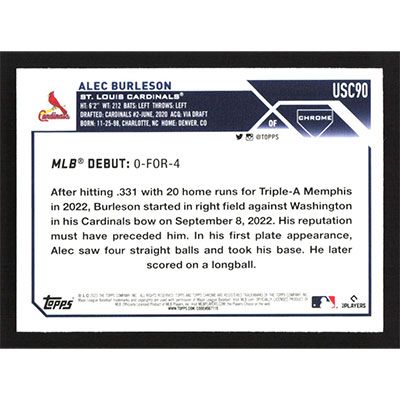 This is a 2023 Topps Chrome Update Alec Burleson Rookie Debut baseball card. The card is #USC90 and pictures show condition. Team(s): St. Louis Cardinals Rookie Card (RC)