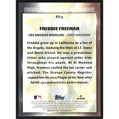 This is a 2023 Topps Favorite Sons Freddie Freeman baseball card. The card is #FS-5 and pictures show condition.