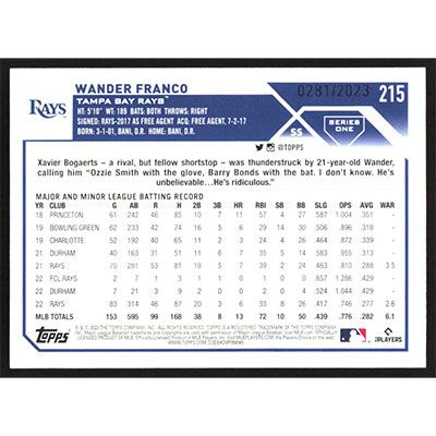 This is a 2023 Topps Gold Wander Franco Future Stars baseball card. The card is #215 and pictures show condition. This card is limited; #'d 0281/2023. Team(s): Tampa Bay Rays