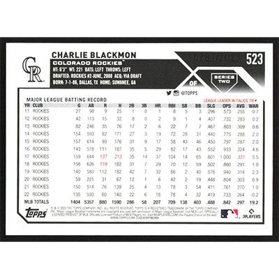 This is a 2023 Topps Gold Charlie Blackmon baseball card. The card is #523 and pictures show condition. This card is limited; #'d 0782/2023. Team(s): Colorado Rockies