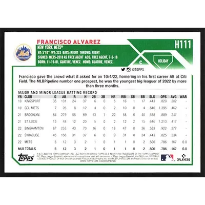 This is a 2023 Topps Holiday Francisco Alvarez baseball card. The card is #H111 and pictures show condition.