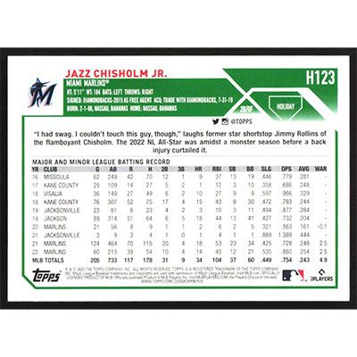 This is a 2023 Topps Holiday Jazz Chisholm Jr. baseball card. The card is #H123 and pictures show condition.