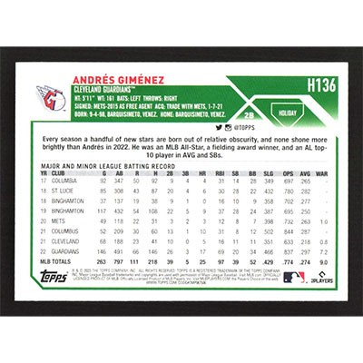 This is a 2023 Topps Holiday Andres Gimenez baseball card. The card is #H136 and pictures show condition.