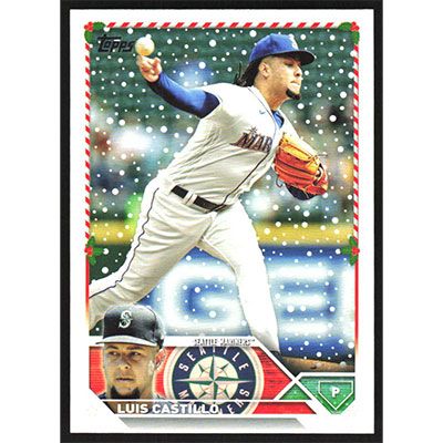 This is a 2023 Topps Holiday Luis Castillo baseball card. The card is #H156 and pictures show condition.