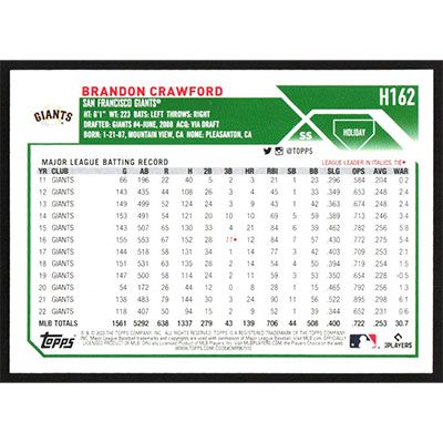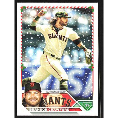 This is a 2023 Topps Holiday Brandon Crawford baseball card. The card is #H162 and pictures show condition.