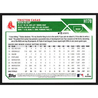 This is a 2023 Topps Holiday Triston Casas baseball card. The card is #H178 and pictures show condition.