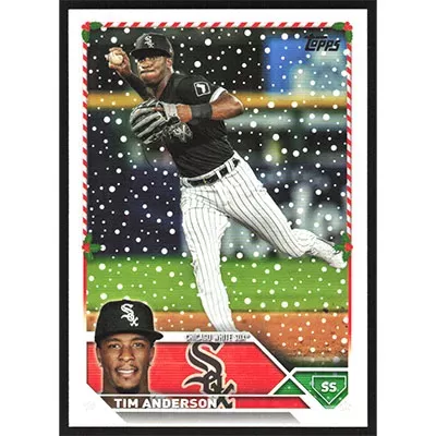 This is a 2023 Topps Holiday Tim Anderson baseball card. The card is #H182 and pictures show condition.