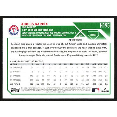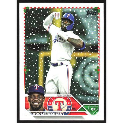 This is a 2023 Topps Holiday Adolis Garcia baseball card. The card is #H195 and pictures show condition.