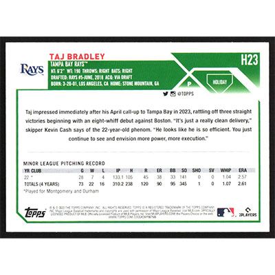 This is a 2023 Topps Holiday Taj Bradley baseball card. The card is #H23 and pictures show condition.