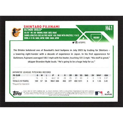 This is a 2023 Topps Holiday Shintaro Fujinami baseball card. The card is #H41 and pictures show condition. Team(s): Baltimore Orioles Rookie Card (RC)
