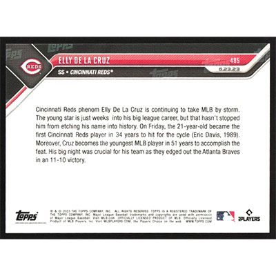 This is a 2023 Topps Now Elly De La Cruz baseball card. The card is #485 and pictures show condition.