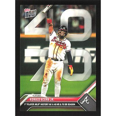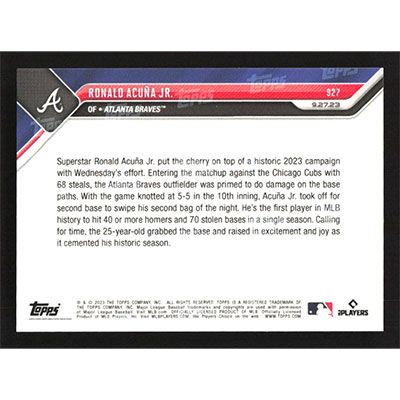 This is a 2023 Topps Now Ronald Acuña Jr. 40/70 baseball card. The card is #927 and pictures show condition.