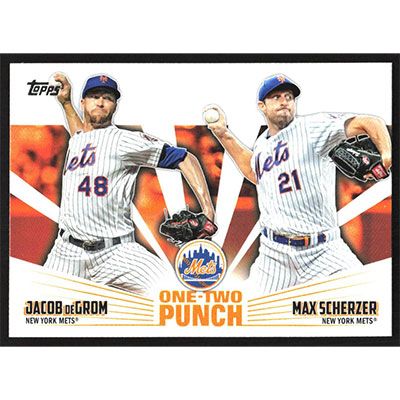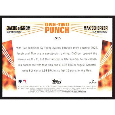 This is a 2023 Topps One-Two Punch Jacob deGrom and Max Scherzer baseball card. The card is #12P-15 and pictures show condition.