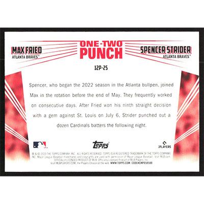 This is a 2023 Topps One-Two Punch Max Fried and Spencer Strider baseball card. The card is #12P-25 and pictures show condition. Team(s): Atlanta Braves
