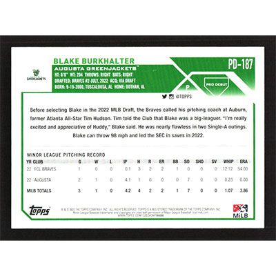 This is a 2023 Topps Pro Debut Blake Burkhalter autographed baseball card. This card has been signed, in blue, by Blake Burkhalter, and is guaranteed authentic by Ballcardz.com. The card is #PD-187 and pictures show condition.