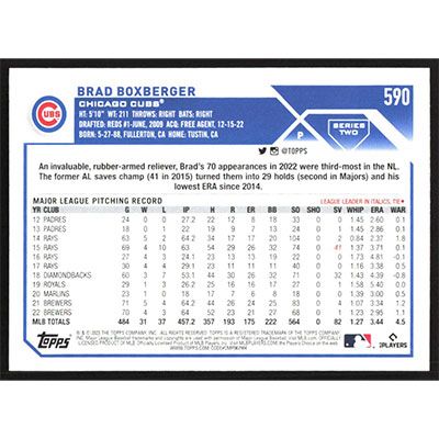 This is a 2023 Topps Royal Blue Brad Boxberger baseball card. The card is #590 and pictures show condition.