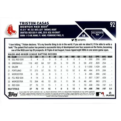 This is a 2023 Topps Silver Foil Triston Casas baseball card. The card is #92 and is in NM-MT condition.