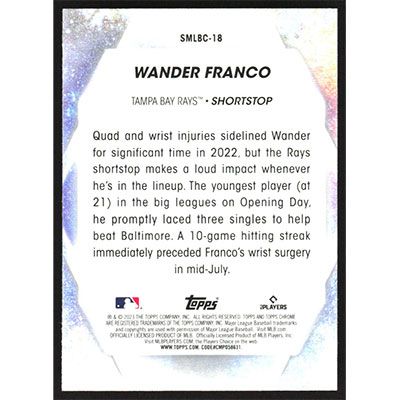 This is a 2023 Topps Stars of MLB Chrome Wander Franco baseball card. The card is #SMLBC-18 and pictures show condition.