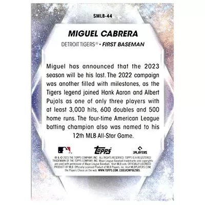 This is a 2023 Topps Stars of MLB Series 2 Miguel Cabrera baseball card. The card is #SMLB-44 and is in NM-MT condition.