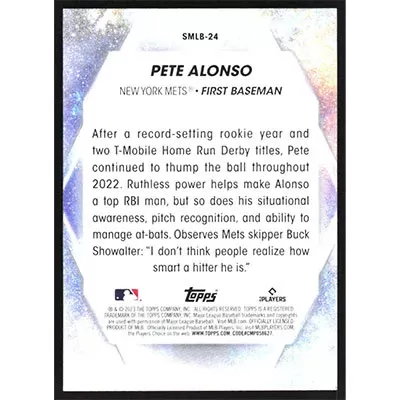 This is a 2023 Topps Stars of MLB Pete Alonso baseball card. The card is #SMLB-24 and pictures show condition.