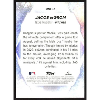 This is a 2023 Topps Stars of MLB Jacob deGrom baseball card. The card is #SMLB-49 and pictures show condition.