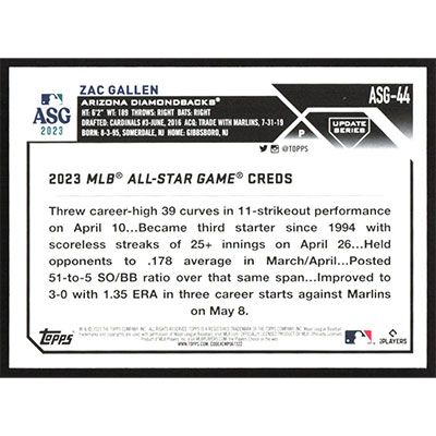 This is a 2023 Topps Update '23 All-Star Game Zac Gallen baseball card. The card is #ASG-44 and pictures show condition.