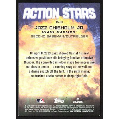 This is a 2023 Topps Update Action Stars Jazz Chisholm Jr. baseball card. The card is #AS-30 and pictures show condition.