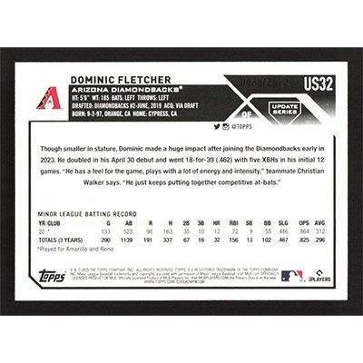 This is a 2023 Topps Update Gold Dominic Fletcher baseball card. The card is #US32 and pictures show condition. This card is limited; #'d 0438/2023. Team(s): Arizona Diamondbacks Rookie Card (RC)