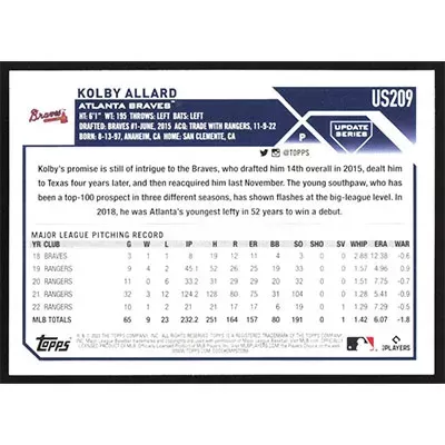 This is a 2023 Topps Update Halloween Orange and Black Foil Kolby Allard baseball card. The card is #US209 and pictures show condition. Team(s): Atlanta Braves