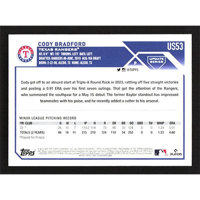 This is a 2023 Topps Update Halloween Orange and Black Foil Cody Bradford baseball card. The card is #US53 and pictures show condition. Team(s): Texas Rangers Rookie Card (RC)