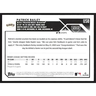 This is a 2023 Topps Update Halloween Orange and Black Foil Patrick Bailey baseball card. The card is #US8 and pictures show condition. Team(s): San Francisco Giants Rookie Card (RC)