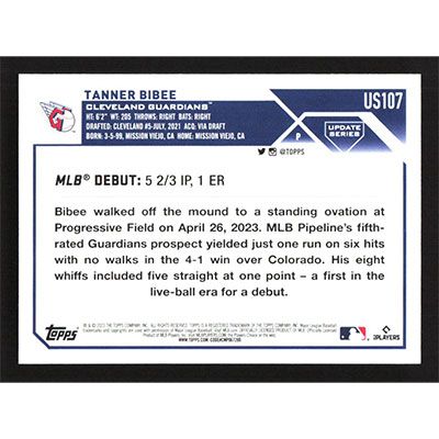 This is a 2023 Topps Update Rainbow Foil Tanner Bibee Rookie Debut baseball card. The card is #US107 and pictures show condition. Team(s): Cleveland Guardians Rookie Card (RC)