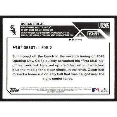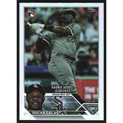 This is a 2023 Topps Update Rainbow Foil Oscar Colas Rookie Debut baseball card. The card is #US205 and pictures show condition. Team(s): Chicago White Sox Rookie Card (RC)