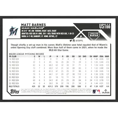 This is a 2023 Topps Update Royal Blue Matt Barnes baseball card. The card is #US166 and pictures show condition.