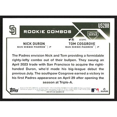 This is a 2023 Topps Update Royal Blue Nick Duron and Tom Cosgrove Rookie Combos baseball card. The card is #US288 and pictures show condition. Team(s): San Diego Padres Rookie Card (RC)