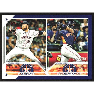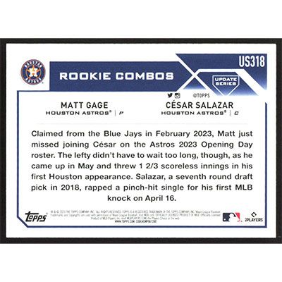 This is a 2023 Topps Update Royal Blue Matt Gage and Cesar Salazar Rookie Combos baseball card. The card is #US318 and pictures show condition. Team(s): Houston Astros Rookie Card (RC)