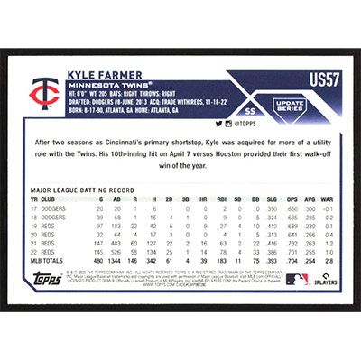 This is a 2023 Topps Update Silver Foil Kyle Farmer baseball card. The card is #US57 and pictures show condition.