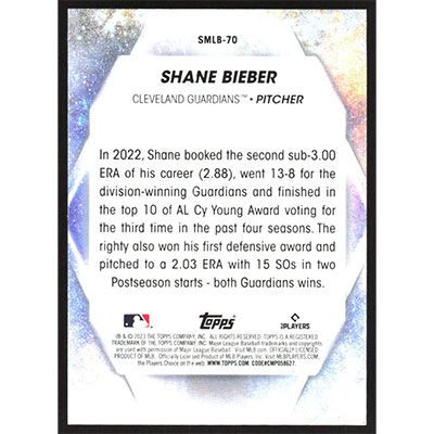 This is a 2023 Topps Update Stars of MLB Shane Bieber baseball card. The card is #SMLB-70 and pictures show condition.