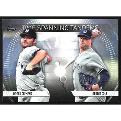 This is a 2023 Topps Update Time Spanning Tandems Roger Clemens and Gerrit Cole baseball card. The card is #TS-23 and pictures show condition. Team(s): New York Yankees