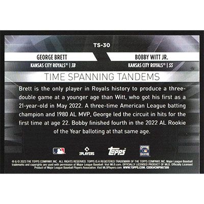 This is a 2023 Topps Update Time Spanning Tandems George Brett and Bobby Witt Jr. baseball card. The card is #TS-30 and pictures show condition. Team(s): Kansas City Royals
