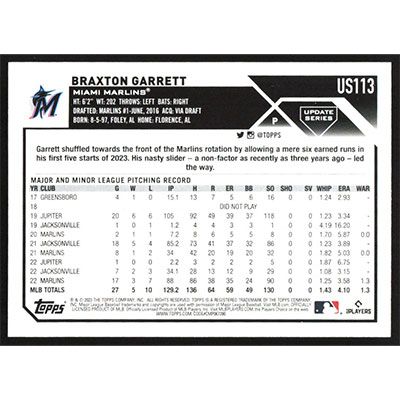 This is a 2023 Topps Update Braxton Garrett baseball card. The card is #US113 and pictures show condition.
