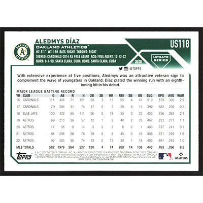 This is a 2023 Topps Update Aledmys Diaz baseball card. The card is #US118 and pictures show condition.