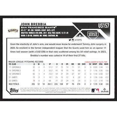 This is a 2023 Topps Update John Brebbia baseball card. The card is #US157 and pictures show condition.